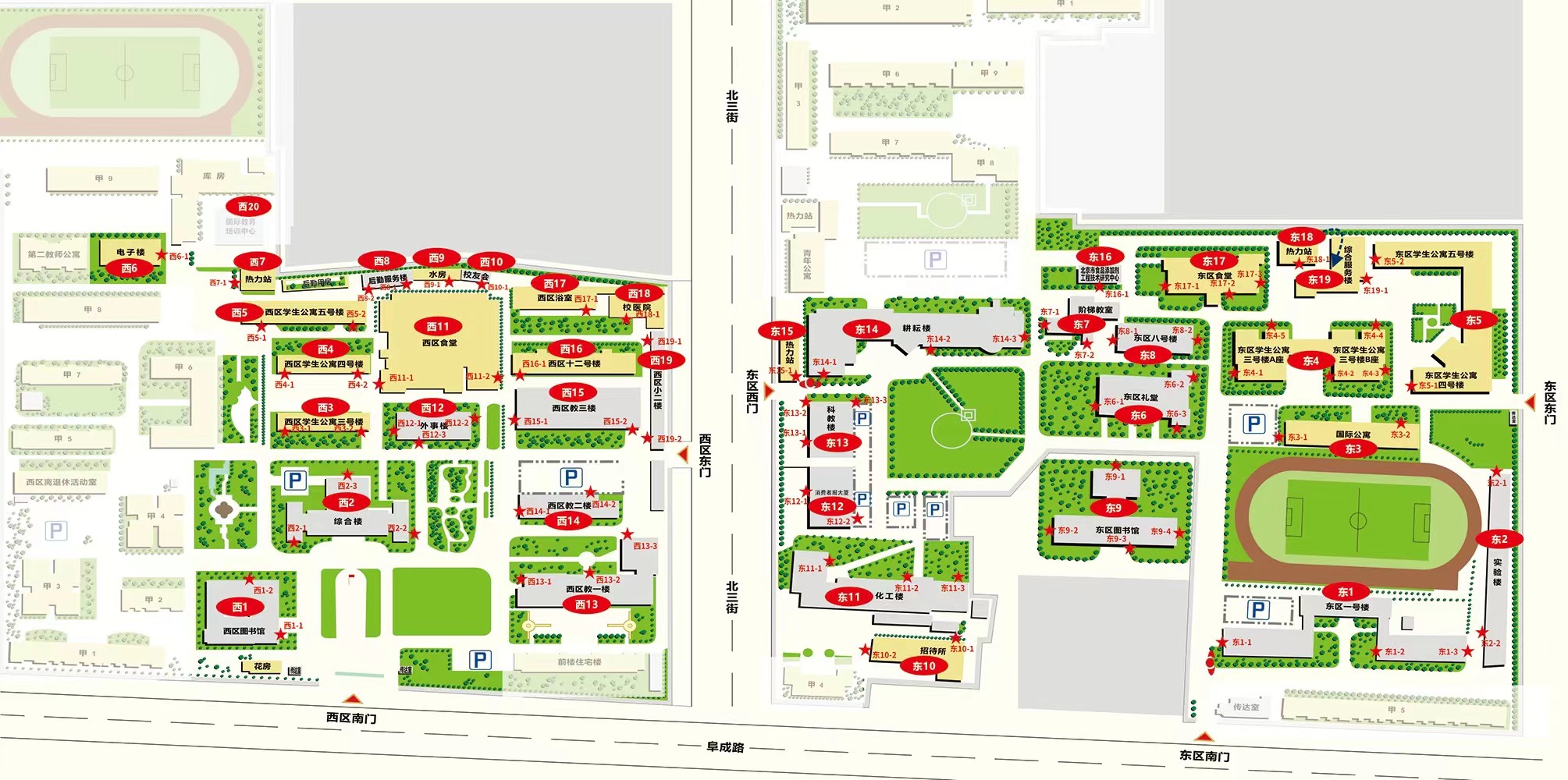 游泳館(東3)、文體館(東2)、圖書館(東19)、鐘樓(東1)、配電室(東16、中2)、鍋爐房(西2)因功能性強,保留原有名稱,不做修改。