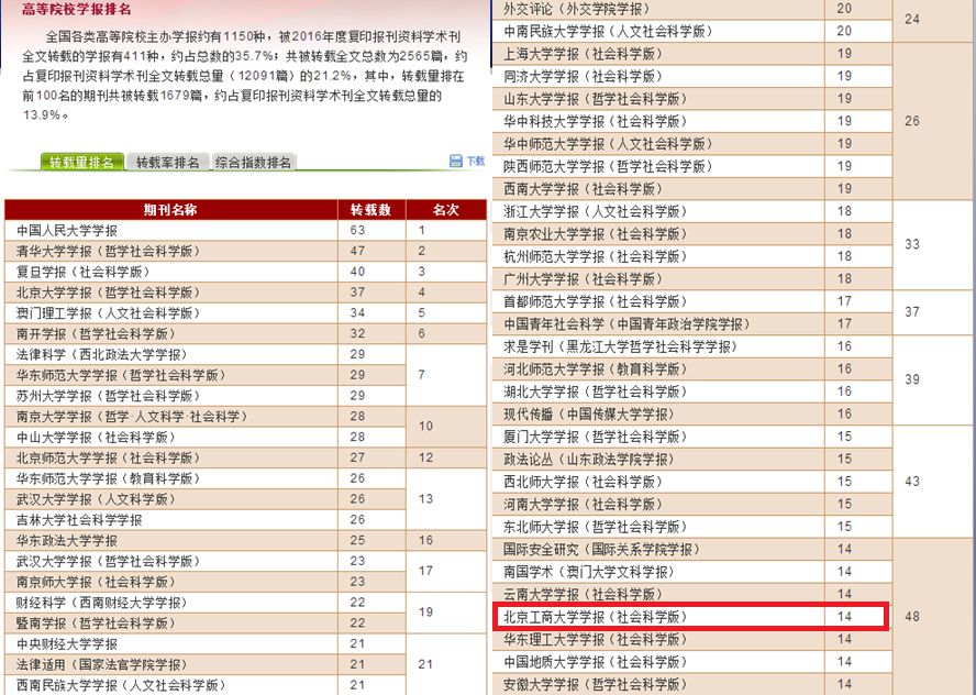 《北京工商大學學報(社會科學版)》2016年度轉載量為14篇,在全國各類高等院校主辦的1150種學報中排名第48位,在包括《中國社會科學》《經濟研究》《管理世界》等權威期刊在內的503種經濟類期刊中排名第29位,首次躋身于該類排名的前30位;轉載率為17.07%,在1150種高校學報中排名第30位,在503種經濟類期刊中排名第24位。
