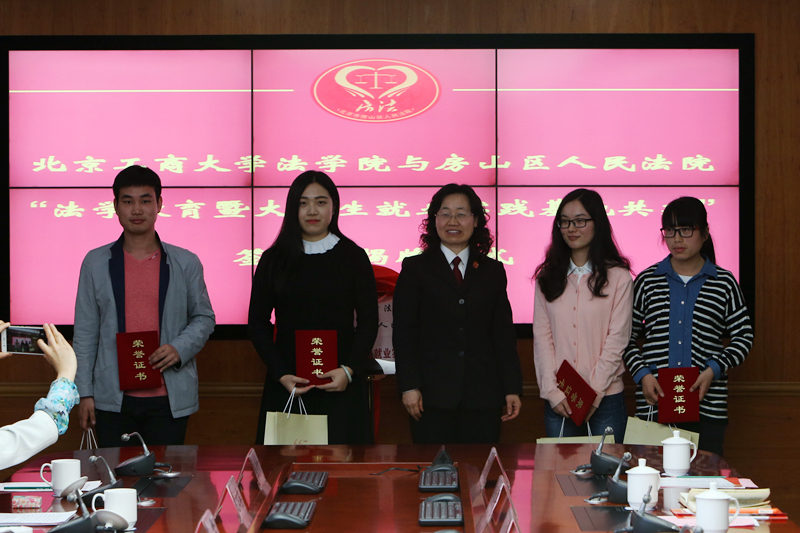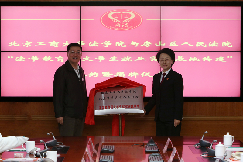 謝安平與邵明艷在共建合作協議書上簽字。李朝鮮與邵明艷為法學院與北京市房山區人民法院“法學教育暨大學生就業實踐基地”揭牌。邵明艷為我校四位實習生頒發“優秀實習生”證書。我校與房山區人民法院通過學生實習基地共建、重點課題調研合作、雙向師資交流、合作開展法律志愿工作等幾方面的合作,以“共建”“共管”和“共享”為原則,共同制訂實踐教學計劃,組織實踐教學團隊開展活動,并共同建設和管理實踐基地,形成常態化、規范化和開放共享的新型實踐教學基地機制。