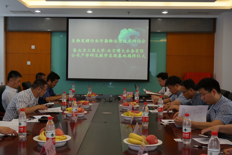 5月20日,生物發酵行業污染物治理技術研討會暨北京工商大學-北京博大水務有限公司產學研基地揭牌儀式在阜成路校區舉行。會議邀請了中國生物發酵產業協會杜軍總干事、北京博大水務有限公司蔣玉明董事長,石曄總工程師,崔勇總經理助理等嘉賓出席。我校教務處左敏處長、食品學院徐寶財院長、研究生院姚志良副院長、食品學院李秀婷副院長等出席。會議還邀請了齊魯工業大學薛嶸教授、北京工商大學錢楓教授、北京化工大學張婷婷副教授、中國環境科學研究院徐夫元副研究員、北京中大立信環境技術有限責任公司孫震董事長等專家及企業界代表出席。環境科學與工程系全體教師參加了會議。會議由環境科學與工程系任連海主任主持。