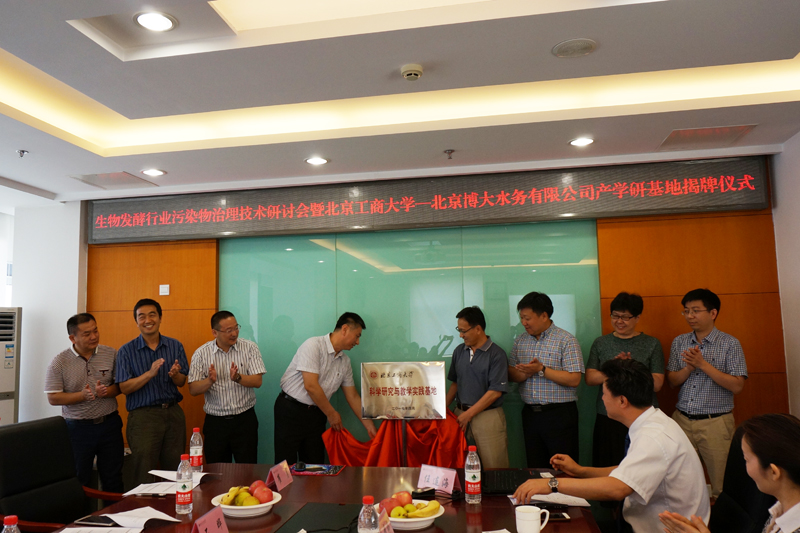 徐寶財首先對各位嘉賓的到來表示熱烈歡迎,對中國生物發酵產業協會及北京博大水務有限公司長期以來對學院工作的支持表示感謝,認為召開生物發酵行業污染物治理技術研討會,搭建協會、高校、企業間的產學研交流平臺是合適與必要的。蔣玉明與任連海分別就各自情況及產學研基地前期準備情況作了介紹。蔣玉明與徐寶財共同為北京工商大學-北京博大水務有限公司產學研基地揭牌,宣布兩家單位之間的合作正式啟動。