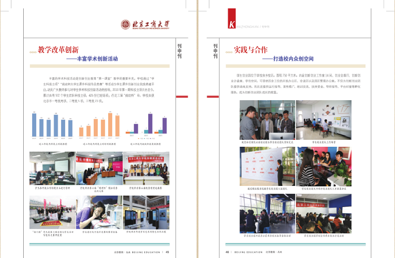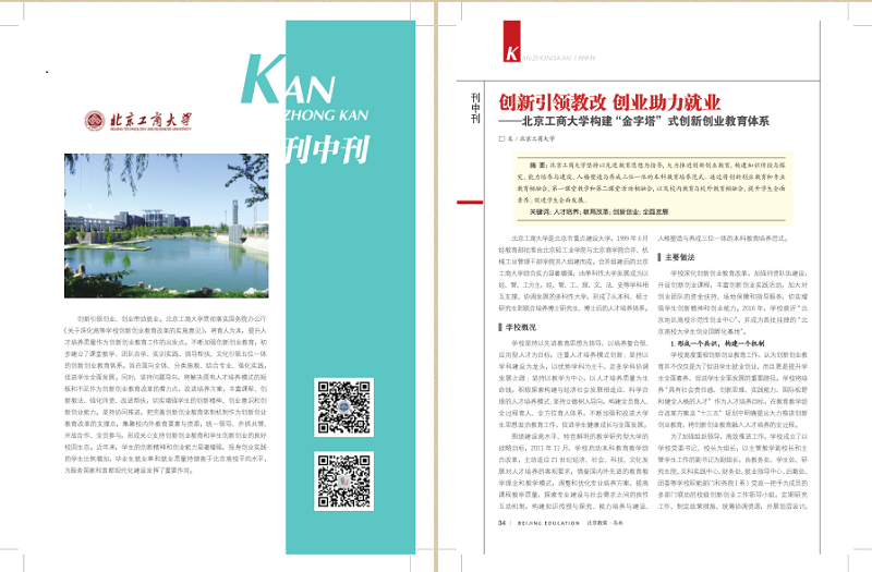 近日,北京教育(高教版)2017年第5期圖文并茂地報道了我校大學(xué)生創(chuàng)新創(chuàng)業(yè)工作。5月16日中國教育新聞網(wǎng)也以“創(chuàng)新引領(lǐng)教改 創(chuàng)業(yè)助力就業(yè)--北京工商大學(xué)構(gòu)建金字塔式創(chuàng)新創(chuàng)業(yè)教育體系”為題對我校創(chuàng)新創(chuàng)業(yè)工作進(jìn)行報道。