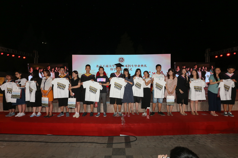 隨后,九個學院的畢業生代表為母校送上了充滿創意、飽含深情的禮物,表達對母校的熱愛,對老師的感恩。理學院學子將親手用6372個圖釘拼成的求知廣場拼圖送給母校,擅長計算的他們用“6372=177名同學*大學4年*對工商的3種情感*對工商的3種祝福”表達了對母校四年培養的感激。食品學院畢業生送上了親手烘焙的蛋糕,他們將以專業態度和使命,帶著母校的期望出發,讓專業素養精益求精。材機學院送給學校一幅由畢業生自主設計和制作的名為“我的大學”的電腦手繪圖,感謝母校對同學們的肯定,表達了對未來的希望。計信學院將榮獲第九屆“挑戰杯”首都大學生課外學術科技作品競賽一等獎的會說話的智能機器人送給母校,表達了對母校培育的感謝。經濟學院畢業生完成的名為“一帶一路 犇騰向前”沙畫作品,象征經院學子將乘勢而上、順勢而行,努力拼搏,祝愿母校早日實現“雙一流”建設目標,為社會輸送更多卓越人才。商學院畢業生制作的以文二樓回廊為主要構圖的七尺畫卷,由商院學子用手印上色的我愛btbu寓意商院學子為母校點贊,為大學四年青春點贊。法學院雙胞胎姐妹共同創作的畫作《圓夢·啟航》,象征法院學子在北工商圓夢,表達了對母校和學院深深的感恩之情。外國語學院67名學生為母校獻上繪有學校標志性建筑物組成的工商書香尺牘畫卷,寄托了同學們在工商四年的印記,代表了外語全體畢業生的祝福。藝術與傳媒學院夢之隊將親手設計制作的畢業設計作品《船》送給母校留作紀念,寓意著工商學子揚起夢想的風帆再起航。戰友協會代表送上了“攜筆從戎、青春無悔”的書法作品,表達了對母校的真摯感謝。黨委書記譚向勇代表學校接受了禮物,并與同學們合影留念。