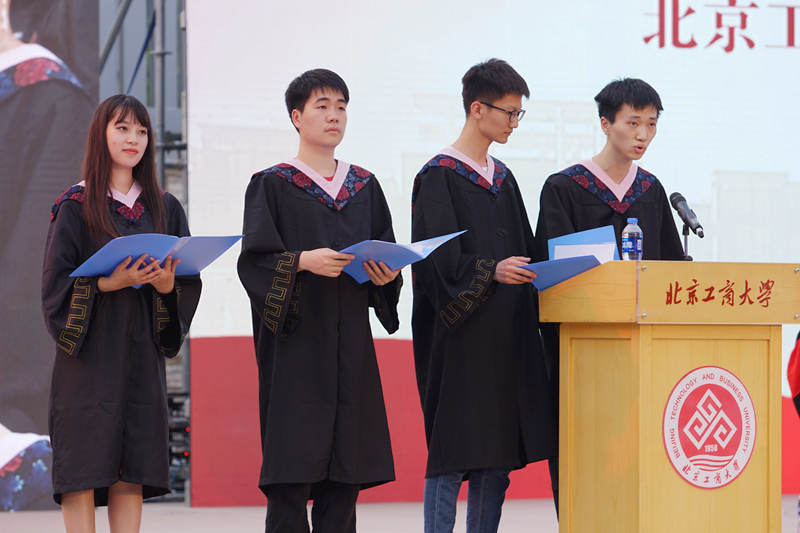 副校長李朝鮮宣讀了《北京工商大學關于2017屆本科生準予畢業及學位授予的決定》,黨委副書記董竹娟宣讀了《北京工商大學關于表彰2017屆優秀本科畢業生的決定》。今年,我校共有2617名本科生準予畢業,2556名本科生獲得學士學位,140人獲得“北京工商大學優秀畢業生”榮譽稱號;另有138名本科畢業生榮獲“北京市優秀畢業生”。