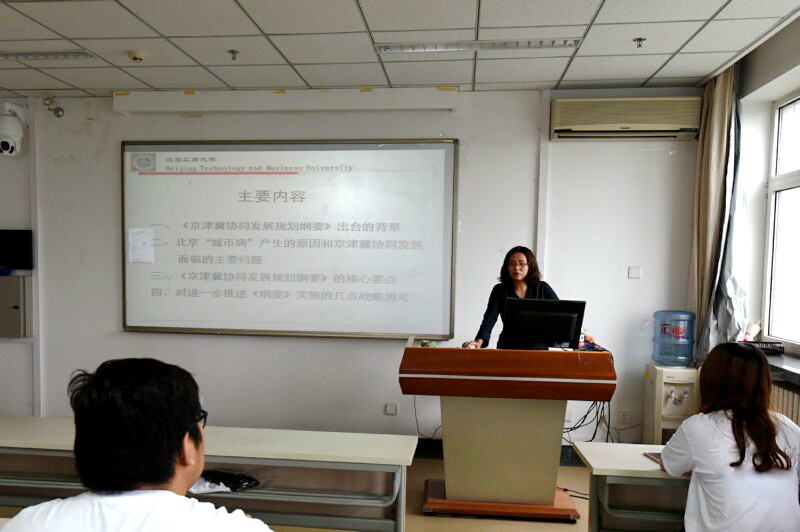 隨后,李麗教授以“京津冀協同發展規劃綱要解讀與戰略思考”為主題展開講座。她從四個方面對京津冀一體化協同發展進行解讀,一是回顧了30年來京津冀區域合作歷程,對《京津冀協同發展規劃綱要》出臺的背景進行介紹,提出京津冀區域的協同發展,要把創新放在重要位置;二是分析了北京“城市病”產生的原因和京津冀協同發展面臨的主要問題;三是講解了《京津冀協同發展規劃綱要》的核心要點,指出京津冀發展要明確三省市各自功能定位,實現京津冀區域的空間結構優化,疏解非首都功能,重點領域率先突破,引領區域協同發展;四是提出了對進一步推進《綱要》實施的幾點戰略思考。
