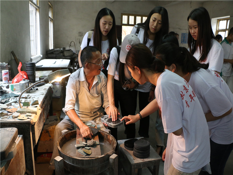 實(shí)踐團(tuán)參觀中國非物質(zhì)文化遺產(chǎn)園開展對非物質(zhì)文化遺產(chǎn)的保護(hù)實(shí)踐。非物質(zhì)文化遺產(chǎn)是承載著中華民族精神與情感的重要載體,但在經(jīng)濟(jì)全球化和現(xiàn)代化快速發(fā)展的現(xiàn)代,我國的非物質(zhì)文化也在遭遇破壞和歧視,所以拯救和保護(hù)非物質(zhì)文化遺產(chǎn)已是迫在眉睫??疾炖虾_文墨廠,參觀了傳統(tǒng)的制墨、制硯流程,工人師傅們經(jīng)驗(yàn)豐富,手藝精湛,徽商精雕細(xì)琢的工匠精神展露無疑,聽非物質(zhì)文化遺產(chǎn)傳承人胡老講解歙硯的選材,打磨,雕刻,欣賞經(jīng)典歙硯,感受中華優(yōu)秀傳統(tǒng)文化的博大精深。
