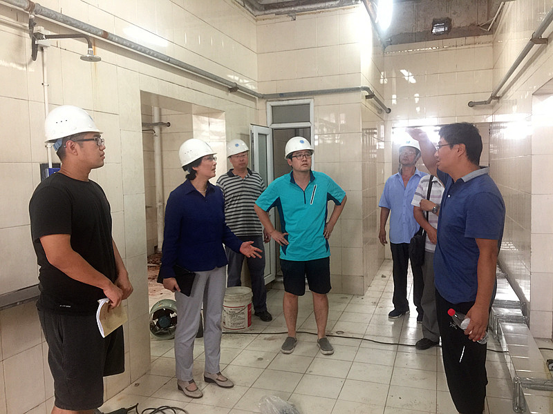 在施工工地現(xiàn)場(chǎng),張?jiān)鸥毙iL(zhǎng)聽取了有關(guān)項(xiàng)目改造內(nèi)容、施工組織設(shè)計(jì)、安全生產(chǎn)管理、進(jìn)度計(jì)劃等情況的匯報(bào),就發(fā)現(xiàn)的一些問題提出意見和工作要求,并向保障我校暑期改造項(xiàng)目安全順利運(yùn)行的設(shè)計(jì)、監(jiān)理、施工單位和一線工人表達(dá)親切的慰問。了解到在改造工程施工期間,后勤基建處要求各方配合采用科學(xué)手段進(jìn)行流水作業(yè)及交叉施工,克服主材加工訂貨周期長(zhǎng)及各專業(yè)工程工序工期不可壓縮的困難,努力做好應(yīng)對(duì)連續(xù)多次強(qiáng)降雨的安全防護(hù)措施。為確保改造后短時(shí)間達(dá)到教學(xué)科研的使用條件,建筑內(nèi)墻涂料均采用環(huán)保型無醛水性涂料;在公用區(qū)域及部分功能房間采用新型LED節(jié)能光源,讓建筑做到了“低能耗、高照度”;對(duì)兩棟以教學(xué)科研為功能體現(xiàn)的建筑進(jìn)行水電改造,建造“樹形”增容系統(tǒng),為今后教學(xué)科研設(shè)備的添置和使用提供條件保障。