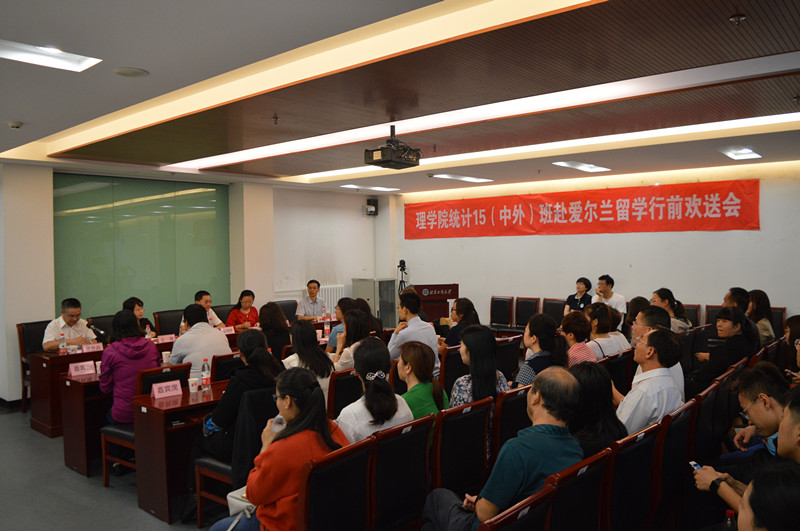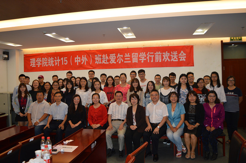 8月27日,理學院舉行統計15(中外合作)班赴愛爾蘭留學行前歡送會。學校副校長李朝鮮出席會議,國際合作與交流處處長劉影、教務處副處長王擎、考克大學中國辦公室主任張蓓、理學院領導祝鈞、李寶河、周艷杰、王嘉彥、數學系老師、輔導員以及統計15(中外)班出國學生和家長參加了會議。會議由理學院院長曹顯兵主持。