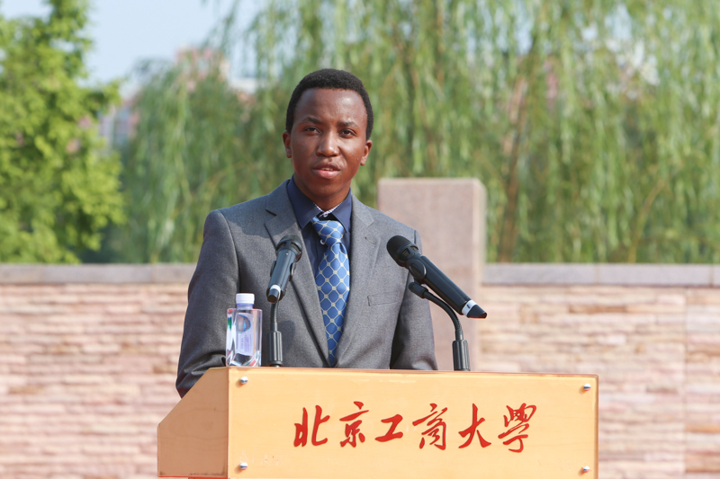 來自津巴布韋的會計專業留學生TARZAN KEITH NYATHI(鄭凱)代表留學生新生發言。他表示非常榮幸來北工商學習,將和留學生們好好學習,探索中國文化,提高各方面能力,并希望能與中國學生互相交流,共同合作,通過努力在未來取得成就和勝利。他期待在北工商度過四年美好的學習時光,并與同學們建立一輩子的友誼。