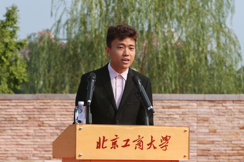 校學生會主席法學院趙靖洲代表全體在校生向新加入北工商大家庭的2017級全體同學表示熱烈歡迎。他與新生們分享了如何完成高中到大學轉變的心得,希望同學們在大學這個知識的殿堂里,學好課程、豐富知識,認真研究自己喜歡的課題,積極參加大學生創新創業比賽和科技立項等活動,同時可以加入學生組織或者學生社團,發展興趣愛好;熱心參加社會實踐和志愿服務,培養責任感,用自己的所學所思服務國家、回報社會。他建議學弟學妹們秉承校訓,用快樂與汗水實現夢想與希望,收獲知識、友誼和成長,讓大學四年成為人生中最美好和有價值的時光。