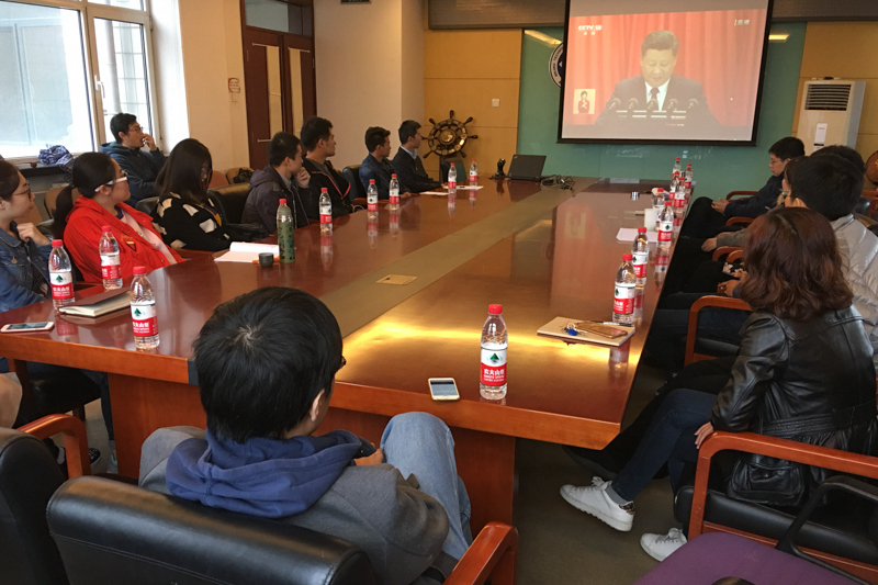 不到9點,學校在兩校區專門安排的收看大會開幕盛況會議室、教室、教師活動中心等收視點已經擠滿了前來收看的師生們。學校黨委理論中心組成員、黨委委員、紀委委員和機關黨委各支部的黨員、黨外知識分子、民主黨派代表、無黨派人士在阜成路校區三層報告廳共同收看了大會的實況轉播。會議室現場,大家聚精會神地聆聽習近平總書記的工作報告,認真地做著筆記,為報告精彩之處熱烈鼓掌。在阜成路校區教工活動中心、良鄉校區行政樓106會議室、文二樓403教室等集中收看地點,離退休黨員、教職工和學生們凝神貫注地收看大會,現場不時響起熱烈掌聲。