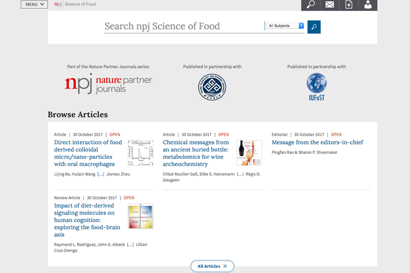 10月30日,我校與施普林格·自然(Springer Nature)旗下的自然科研集團(Nature Research)和國際食品科學技術聯(lián)盟(IUFoST)三方合作出版的高影響力的開放獲取期刊《npj Science of Food》正式上線。