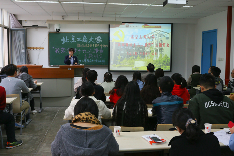 “如何全面把握十九大報告的主要精神和重要意義?”“如何理解新時代青年大學生的使命?”“如何發揮專業優勢,強化食品安全戰略,讓人民吃得放心?”11月6日下午,食品學院應用化學專業162班召開“我來領讀十九大報告”主題班會,同學們分享了自己研讀十九大報告的心得,并一同聆聽了校長孫寶國院士主講的“以實際行動貫徹落實十九大精神”的微黨課。