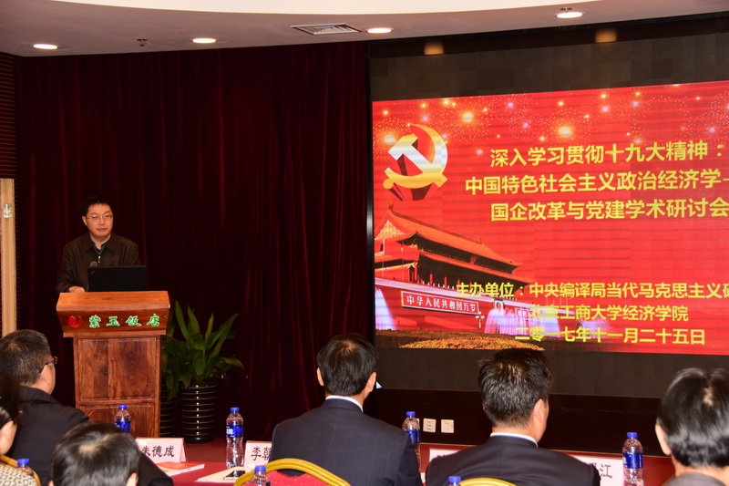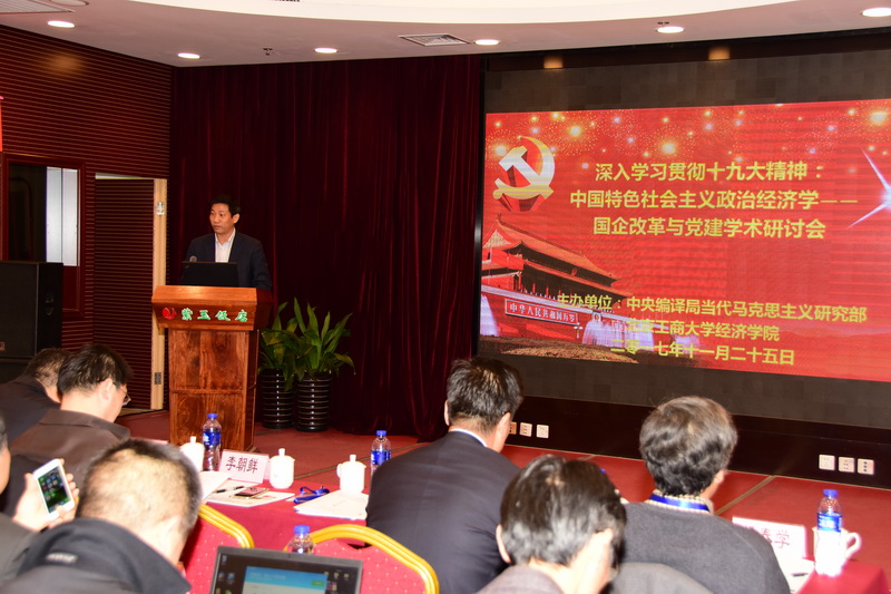 李朝鮮副校長首先致辭,他對各位專家學者的到來表示熱烈的歡迎。他介紹了我校學科、專業建設的情況,他指出,今年是國有企業改革“建設年”,恰逢黨的十九大勝利召開,本次研討會的召開正當其時,意義重大,必定會對進一步學習貫徹黨的十九大精神、深化國有企業改革領域的學術研究產生重要的推動作用,對我校經濟學學科建設具有積極的意義,他預祝大會取得圓滿成功。中央編譯局當代馬克思主義研究部陳家剛主任在致辭中提出國企改革與黨建理論是中國特色社會主義政治經濟學的重要組成部分,黨的十九大對我們黨和國家的許多方面都提出了新的要求,國有企業如何適應新時代變化和響應新時代要求,為我國經濟社會發展做出新的貢獻,需要學術理論界進行深入討論。