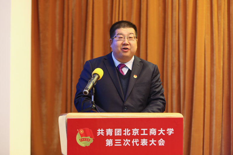 團市委副書記李健代表共青團北京市委員會對大會的召開表示熱烈祝賀,并充分肯定了學校在第二次團代會召開以來各項工作所取得的成績。他希望學校各級共青團組織要認真學習宣傳貫徹黨的十九大精神,在學懂弄通上下功夫;深入貫徹落實中央和北京市共青團改革的各項任務,大力推進從嚴治團;堅持以圍繞中心服務大局為主線,為建設國際一流的和諧宜居之都做貢獻。并希望即將選舉產生的共青團北京工商大學第三屆委員會一定要在黨的十九大精神引領下,在學校黨委和團市委的堅強領導下,在各級團干部和廣大團員青年的一致努力下,銳意進取,埋頭苦干,乘勢而上,為決勝全面建成小康社會、奪取新時代中國特色社會主義偉大勝利、實現中華民族偉大復興的中國夢貢獻青春智慧和力量!