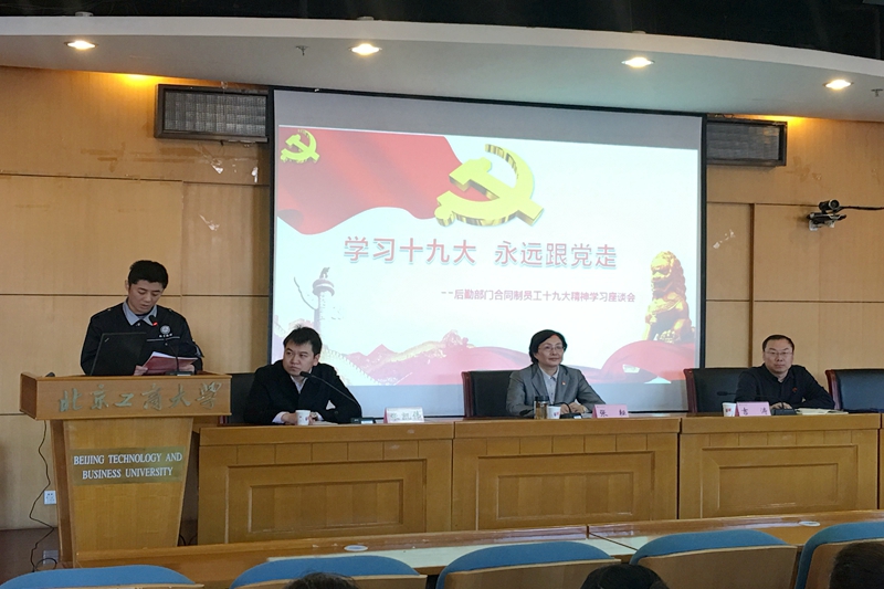 在聽取大家的發言后,副校長張耘結合個人體會與全體同志進行了交流。她談到,合同工隊伍是保障學校各項事業發展和更好地發揮高校四項職能的重要力量。廣大師生的衣食住行、學校的環境維護和提升都離不開合同工在各自崗位中做出的努力,希望大家主動學習、開闊視野、了解形勢、提高站位,把個人生活學習發展與社會、學校的發展緊密結合起來。學習宣傳貫徹黨的十九大精神對每一位合同工包括家人都具有非常重要的意義。通過學習不僅能夠了解國家發展的目標,也有助于明確個人的努力方向。她就十九大精神中和后勤基建有著緊密聯系的方面做了深入淺出的分析,希望大家認真體會習近平總書記指出道路自信、理論自信、制度自信和文化自信的深刻含義,進而對我們黨和國家充滿信心,對學校發展充滿自信。她還同大家分享了曾經是木匠出身的李瑞環同志的著作——《學哲學 用哲學》的部分內容,希望后勤基建同事能夠以研究實招、堅持實干、注意用人和加強協作的態度和工匠精神對待日常工作。