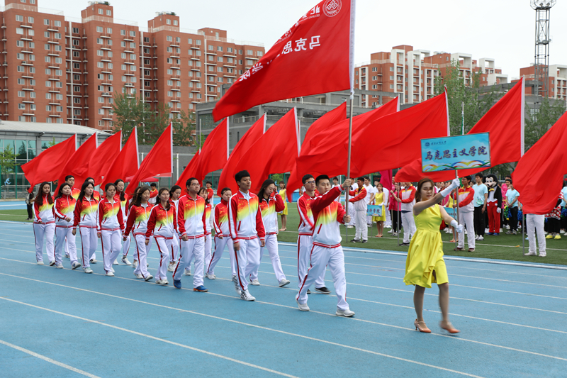 經(jīng)濟學(xué)院方隊以“一帶一路”為主題,結(jié)合紅綢、黃扇、民族舞,展示人類命運共同體的寓意;商學(xué)院方隊以紅色為“激情”,以黃色為“奮斗”,飛舞的綢帶,靈動的劍法譜寫著他們對于夢想的赤忱之心;法學(xué)院代表團(tuán)一襲白衣,手握紅傘,剛?cè)岵卣宫F(xiàn)了運動精神與力量之美;外國語學(xué)院紅旗招展,精神抖擻,用整齊劃一的動作與響亮的口號詮釋了新時代下《中國人》的風(fēng)采;藝傳學(xué)院方隊以整齊的步伐、優(yōu)美的舞姿、良好的精神面貌證明他們必勝的勇氣和力量;馬克思主義學(xué)院方隊由研究生代表組成,他們不僅有嚴(yán)謹(jǐn)求實的學(xué)術(shù)研究,更有馳騁賽道的勇氣。