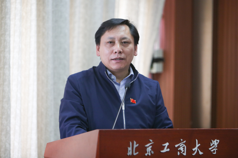 在嘹亮的國歌中大會正式開始。后勤基建處處長吉濤代表后勤部門做工作報告,介紹了后勤部門工作進展、隊伍狀況及下一步工作思路。他談到,后勤部門落實巡視整改任務、強化基礎設施建設改造、提升服務保障水平和深化黨風廉政建設等卓有成效,2017年獲得了全國“校園節水·安全供水·智慧管理”樣板示范校、全國教育后勤系統信息宣傳工作先進單位、2017全國教育節能傳播獎、北京工商大學黨建創新案例等榮譽,服務保障工作獲得了師生理解、支持和肯定。他提出,下一步學校后勤工作要從“管理范式、服務模式、監督方式”方面進一步深化改革創新,以科學化的規劃、精細化的管理、標準化的運行、人本化的服務做好后勤服務保障。