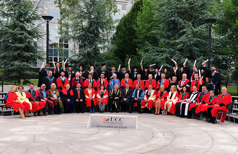當?shù)貢r間6月15日10時許,伴隨著考克大學嘹亮的校歌聲,畢業(yè)典禮在熱烈而莊重的氛圍中拉開帷幕。曹顯兵院長應邀坐在畢業(yè)典禮主席臺,與愛爾蘭考克大學校長帕卷克•奧謝伊(Patrick G.O'Shea)教授一同為兩校聯(lián)合培養(yǎng)的首屆雙學位畢業(yè)生一一頒發(fā)學士學位證書。會后,典禮主席臺所有成員與全體2018屆畢業(yè)生合影留念。