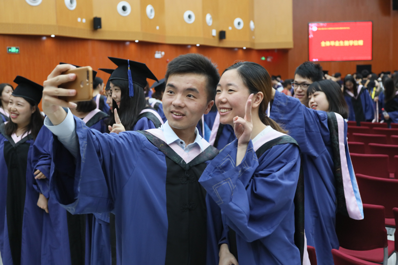 在激昂的樂曲聲中,同學(xué)們身著學(xué)位服依次有序走上主席臺(tái),校領(lǐng)導(dǎo)、校學(xué)位評(píng)定委員會(huì)委員為他們扶正流蘇并留下珍貴合影。學(xué)位授予儀式最后,在“我要飛得更高”的音樂聲中,畢業(yè)生們歡呼著“畢業(yè)啦!”并一起把學(xué)位帽拋向空中,為畢業(yè)典禮畫上了圓滿的句號(hào)。鮮花、掌聲、歡笑、淚水,禮堂里到處都是畢業(yè)的喜悅和分別的愁緒。
