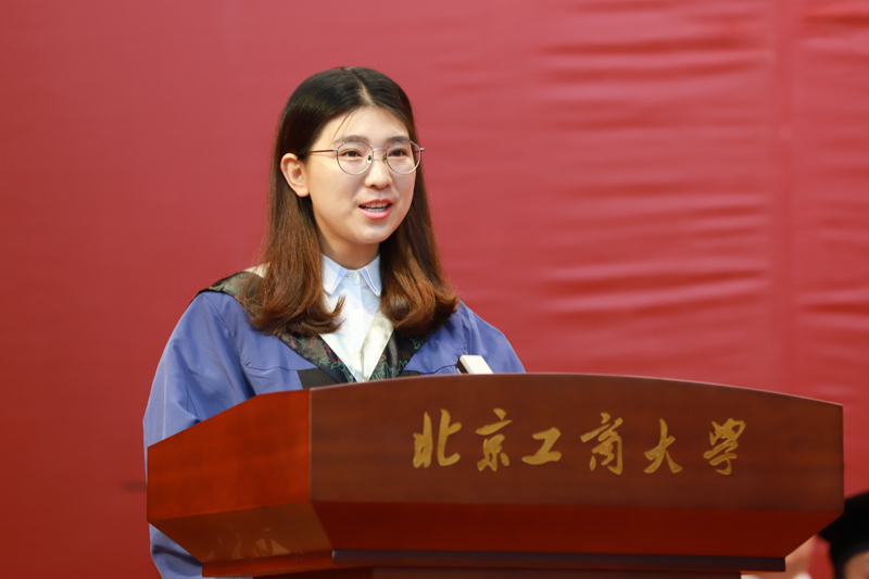 畢業(yè)生代表、理學(xué)院2018屆碩士畢業(yè)生杜姜楠在發(fā)言中代表全體研究生畢業(yè)生對(duì)母校的辛勤培育、老師的殷切教導(dǎo)表示衷心的感謝。她回顧了在校學(xué)習(xí)、生活的點(diǎn)點(diǎn)滴滴,感謝母校這片熱土提供給廣大研究生寬廣的平臺(tái),并表示為母校取得博士學(xué)位授予點(diǎn)感到驕傲和自豪。她用九個(gè)感謝和自己譜寫的一曲《北工商》歌詞表達(dá)對(duì)母校的依依惜別之情,勉勵(lì)畢業(yè)生們?cè)趯?shí)現(xiàn)自我價(jià)值的同時(shí),為祖國(guó)的繁榮昌盛、為新時(shí)代的蓬勃發(fā)展貢獻(xiàn)一份自己的力量。