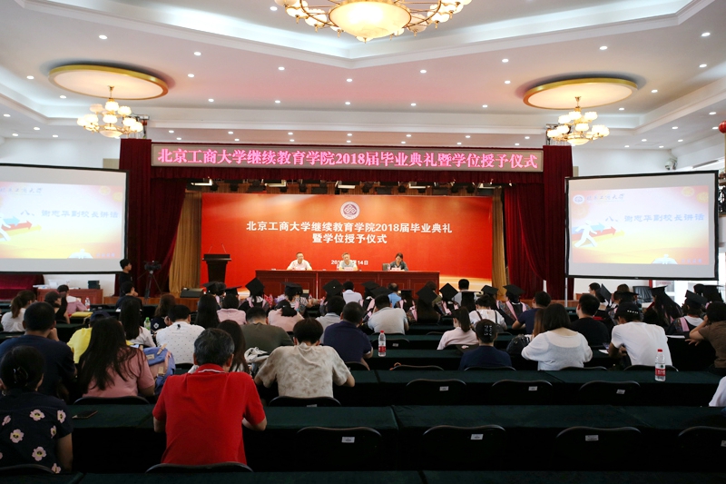 在雄壯的國歌聲中,典禮正式開始。顧紅宣讀了《北京工商大學繼續教育學院關于2018屆成人教育學生準予畢業及授予學位的決定》《北京工商大學繼續教育學院關于表彰2018年優秀教師的決定》《北京工商大學繼續教育學院關于表彰2018屆優秀畢業生的決定》。2018屆共有343人應屆畢業獲得畢業證書,包含業余、函授兩類,應屆、往屆兩種,高起本、專升本、專科三個層次,畢業生中年齡最小的18歲,最大的47歲,絕大多數為20、30歲的在職青年。其中56人被授予學士學位,有15人被評為優秀畢業生。授課教師中有9人被評為優秀教師。