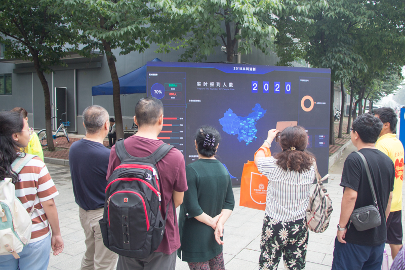 報(bào)到現(xiàn)場(chǎng),實(shí)時(shí)反映迎新工作數(shù)據(jù)的藍(lán)色電子屏引來(lái)新生和家長(zhǎng)們駐足。這是學(xué)生處首次嘗試全程采用電子大屏“直播”新生報(bào)到的情況,通過(guò)電子大屏,大家可以隨時(shí)了解到學(xué)校和各學(xué)院新生報(bào)到注冊(cè)人數(shù)以及各時(shí)段新生報(bào)到情況,充分體現(xiàn)了大數(shù)據(jù)時(shí)代的服務(wù)升級(jí)。