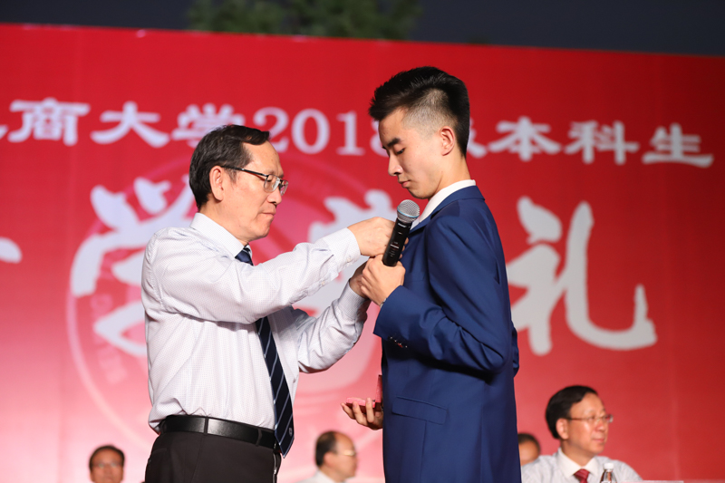 首先進行的是新生?;张宕鲀x式。迎新報到現場,每位新生都領到了學校精心制作的校徽。小小的?;粘休d著學校68年辦學歷史和“求真、立德、勤奮、創新”的工商校訓,是學校精神和校園文化的集中體現。學校黨委書記譚向勇教授現場為新生代表安亞龍同學佩戴?;?,全體新生也起立自行將?;张宕饔谧笮厍啊P律鷤儙闲;眨瑥拇顺蔀楸惫ど倘?。