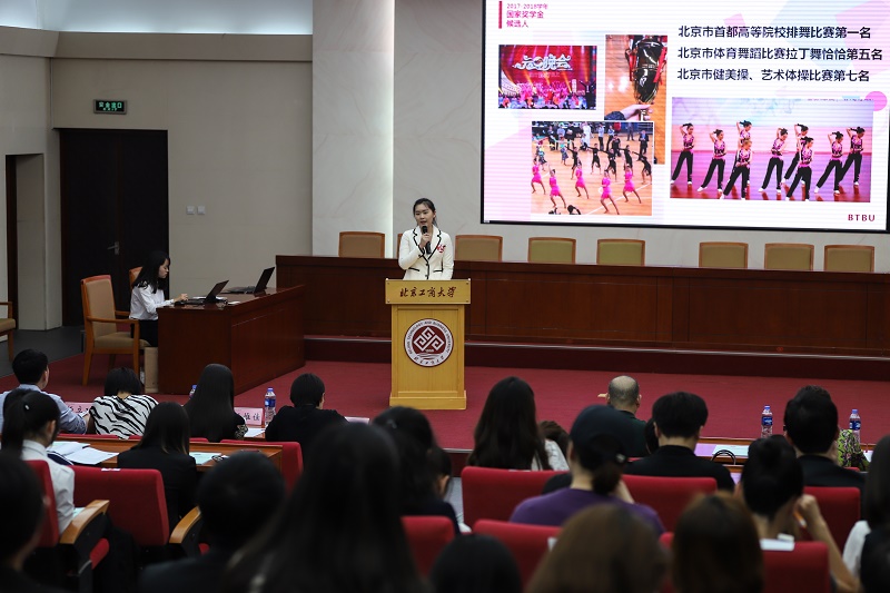 評審會在莊嚴的國歌聲中開幕。來自9個學院的32名國家獎學金候選人按照抽簽順序依次上臺,通過3分鐘的PPT展示自己在學習、科研、學生工作、社會實踐、競賽獲獎、志愿服務等方面取得的成績。理學院姜懿軒同學在數學分析、高等代數等7門課程中均取得滿分;食品學院蘇青松同學品學兼優,已取得浙江大學、天津大學、中科院的保研擬錄取資格;材機學院胡倩同學喜愛音樂,并獲得北京市大學生音樂節銀獎;計信學院姜珍同學在校期間平均每20天參與一項學科競賽,國際級大獎收獲頗豐;經濟學院陶暢同學作為暑期社會實踐的負責人,帶領團隊獲得首都暑期社會實踐“最美故事”評選大賽、百強團隊一等獎等多項榮譽;商學院顧云同學積極在黨建工作中創新形式,帶領學生支部在賈河村開展多次共建活動,獲北京市三等獎。法學院邵慶同學用所學所思為正義發聲,獲得了北京市教委主辦的大學生模擬法庭競賽二等獎;外國語學院張雪丹同學工作突出的同時不忘科研,現已在核心期刊發表兩篇論文;藝傳學院翟少昂同學不僅努力創新創業,還發布了七張個人專輯。候選人的優秀事跡贏得了現場評委、老師熱烈的掌聲。