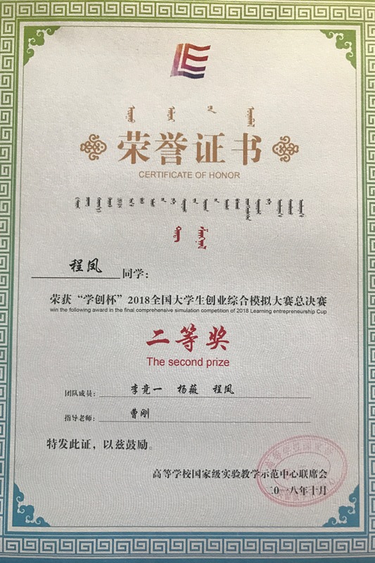 10月12日至14日,“學創杯”2018大學生創業綜合模擬大賽全國總決賽暨全國高校創新創業實踐教學研討會在內蒙古財經大學舉行。我校由經濟學院文科實踐中心曹剛、朱建方老師指導,統計16程鳳、保險16李競一、注會161楊薇、財務161李雙、信管161郭暢、軟件17張鑫組成的代表隊,以優異的成績榮獲全國總決賽二等獎,曹剛老師榮獲優秀指導教師獎。