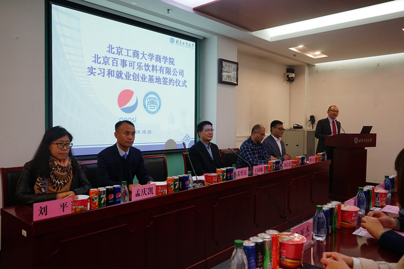 為進一步加強學校和企業之間的交流合作,探索實踐科學的大學生實習、就業、創業運作模式和長效機制,10月25日,我校商學院與北京百事可樂飲料有限公司舉行實習和就業創業基地簽約儀式。康師傅控股校企關系總監蘇哲民、北京百事可樂飲料有限公司人資主管劉平、北京百事可樂飲料廠廠長孟慶凱等企業代表,商學院院長王國順、副院長楊浩雄、工商管理系主任鄧春平、物流管理系主任張浩、市場營銷系主任張運來等院方代表,以及商學院50余名本科生和研究生代表出席了簽約儀式,儀式由商學院黨委副書記樊江濤主持。