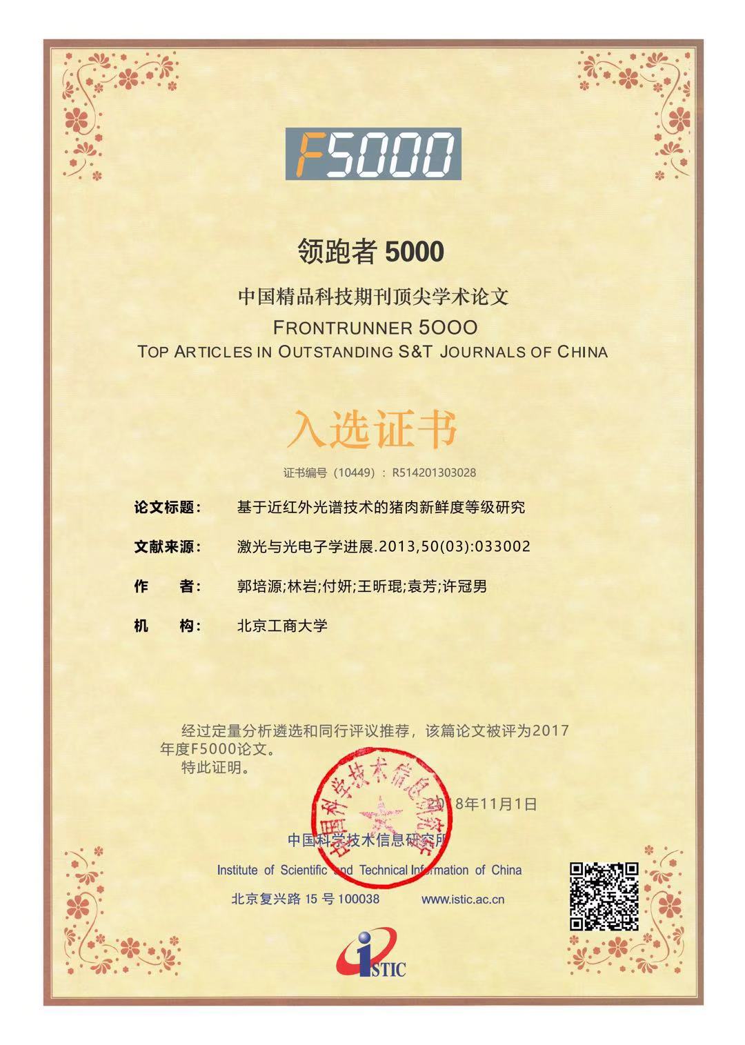 近日,在中國科學技術信息研究所發布的“領跑者5000(F5000)——中國精品科技期刊頂尖學術論文”名錄中,我校計算機信息與工程學院郭培源教授作為第一作者于2013年發表的《基于近紅外光譜技術的豬肉新鮮度等級研究》、我校食品學院謝建春教授、孫寶國院士于2014年發表的《漢源紅花椒和金陽青花椒香氣活性成分研究》論文獲得入選。這是我校再度入選F5000的論文。