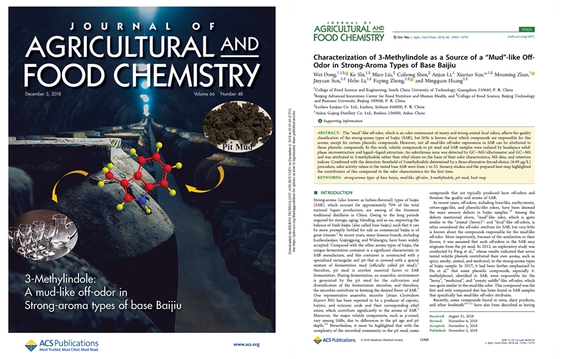 近日,我校食品學院“白酒化學”研究團隊以董蔚為第一作者,孫嘯濤為通訊作者在美國化學學會期刊Journal of Agricultural and Food Chemistry最新一期(2018,Volume 66,Issue 48)發表了題為 “Characterization of 3-Methylindole as a Source of a ‘Mud’-like Off-Odor in Strong-Aroma Types of Base Baijiu” 的封面論文。