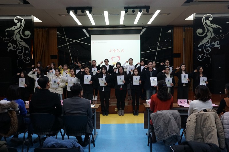 蓋曉慶副處長宣讀了《關(guān)于聘任2019年度“學(xué)生資助宣傳大使”的決定》,并與張德玉副書記共同為新聘資助大使頒發(fā)聘書及紀念徽章。30名大使在全場老師和同學(xué)面前莊嚴宣誓,爭做勵志成才的先行者、資助政策的傳播者和知恩、感恩的踐行者。