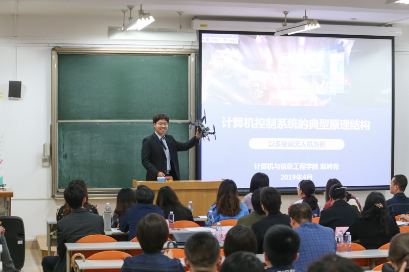 決賽現(xiàn)場,每位參賽選手都通過20分鐘的課堂教學(xué)演示,展現(xiàn)了自己扎實的教學(xué)基本功和新穎的課堂安排。文科組來自商學(xué)院的仇勇老師,從大家關(guān)注的“五一假期”導(dǎo)入,為在場聽眾講解了法定假期與加班工資的測算,語言風(fēng)趣幽默,富有親和力。文科組來自藝術(shù)與傳媒學(xué)院的鄧瑩潔老師,通過形象生動的教學(xué)展示和設(shè)計獨特的現(xiàn)場互動,為“外國留學(xué)生”講解了漢語的語法與用法。理工科組來自計算機與信息工程學(xué)院的趙峙堯老師,在輕松風(fēng)趣的語言和燦爛的笑容中,運用多旋翼無人機實體道具,為大家生動形象地介紹了計算機控制系統(tǒng)的典型原理結(jié)構(gòu)。理工科組來自計算機與信息工程學(xué)院的孫茜老師,通過電梯和機床臺的視頻引入主題,為在場聽眾講解了三相異步電動機正反轉(zhuǎn)控制電路的原理,課件精美,舉例恰當(dāng)。