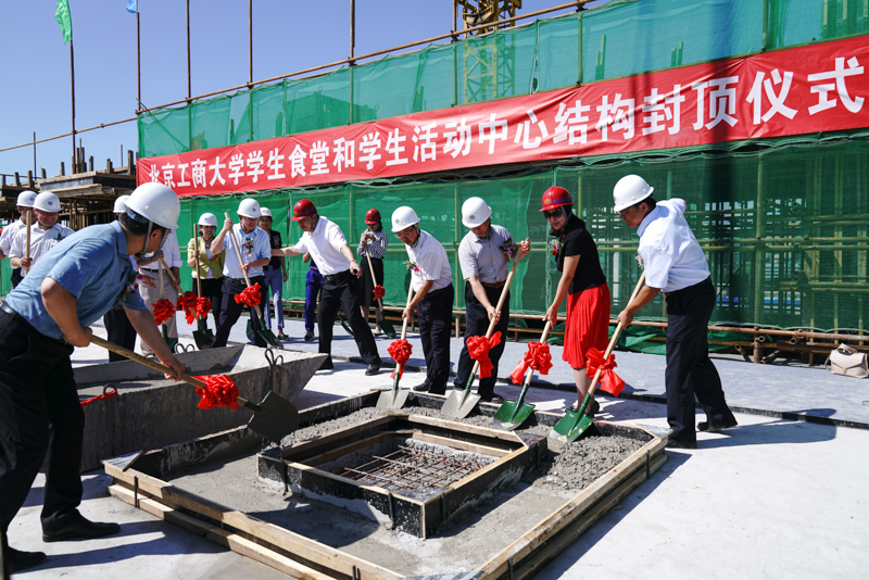 8月30日上午,16-02-01地塊學生食堂和學生活動中心項目主體結構封頂儀式在良鄉校區二期新建工程工地現場隆重舉行。學校黨委書記黃先開,校長孫寶國,副校長張耘、方德英,中國新興建設開發有限責任公司黨委書記沙吉培、建研凱勃建設工程咨詢有限公司副總經理崔建永、中國中輕國際工程有限公司副院長何嘉欣、中競發工程管理咨詢有限公司副總經理沈毅出席儀式。學校相關部門代表、師生代表及參建單位代表等50余人參加了封頂儀式。儀式由副校長張耘主持。
