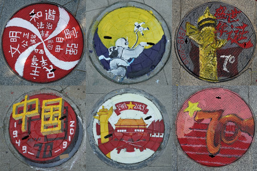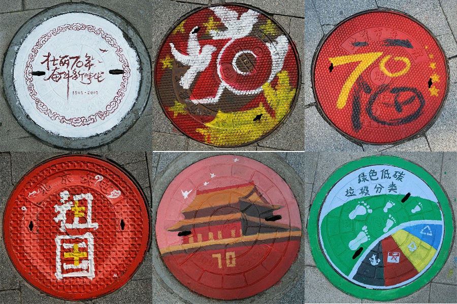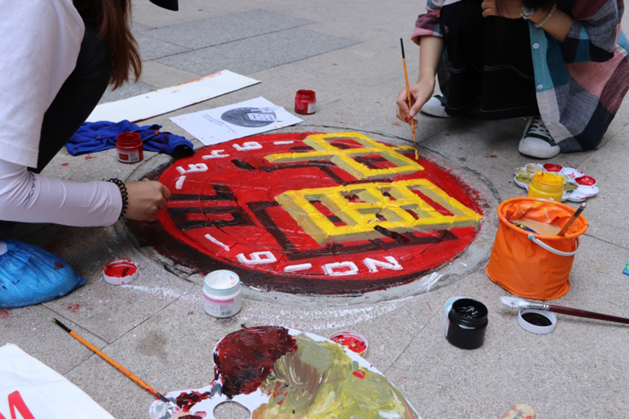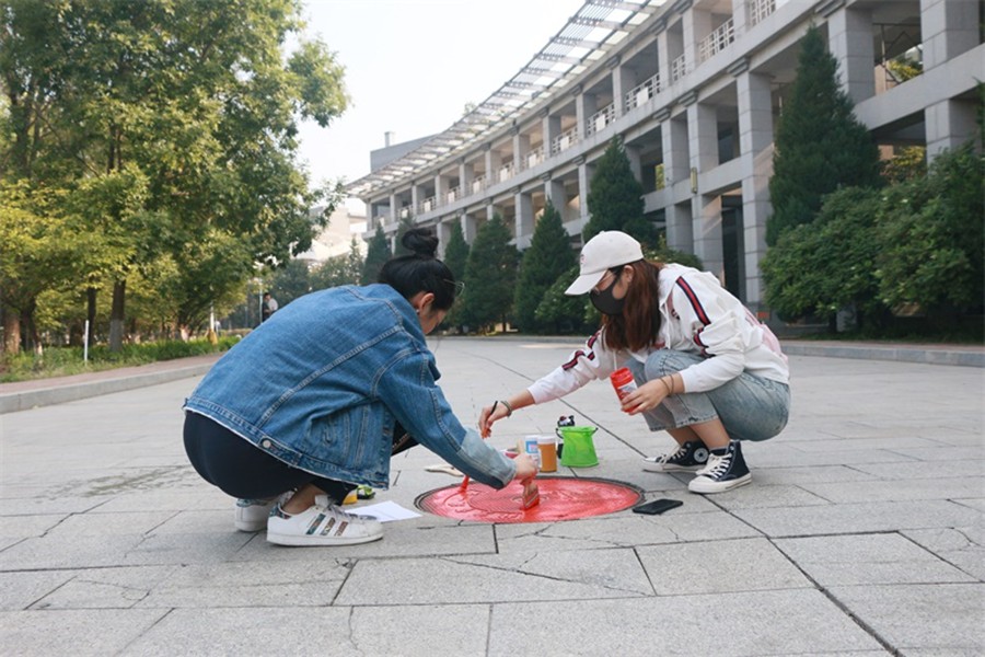 9月28日上午,所有參賽者和70名志愿者共同在良鄉校區開展井蓋文化作品的彩繪創作。在全體工作人員、參賽者和志愿者們的相互配合下,歷經3個多小時,精挑細選出的70幅井蓋文化作品在同學們的專注創作下躍然于井蓋上,作品既有個人獨立創作,亦有團隊配合創作,一起為樸素的井蓋繪上精心設計的圖案。來自藝術與傳媒學院視覺傳達設計專業孫逸文用一座華表描繪出祖國在他心中的高大形象。李艾瑾和川景怡不約而同地以高鐵為中心進行了設計,表現出了對祖國飛速發展的贊美和期望。劉天和他的團隊將中國航天取得的成就描繪于井蓋上。