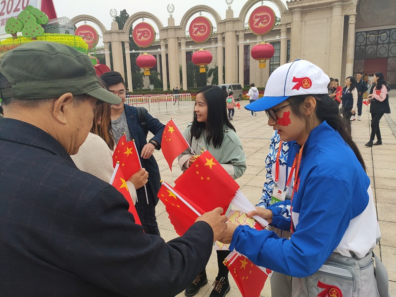 10月19日,在北京展覽館廣場上進行了“我和我的祖國”快閃活動,我校志愿者參與其中,為現場參觀游客發放小國旗,志愿者們飽含熱情,帶動現場氣氛,引導現場觀眾融入快閃活動中來。看到整個廣場沉浸在一篇為祖國歡呼的海洋中,志愿者感慨紛紛被現場濃厚的愛國氣氛感動,能為參加本次志愿服務,參與到慶祝祖國70周年生日的活動感到榮幸和自豪。