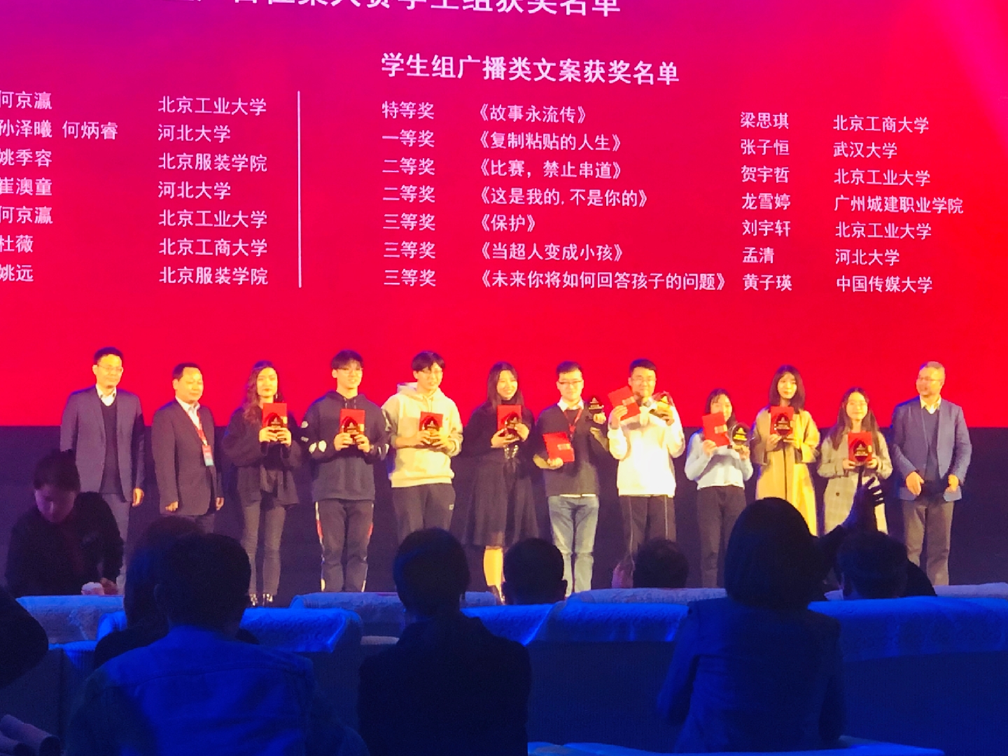 11月11日,由國家廣播電視總局、北京市人民政府指導(dǎo),中共北京市委宣傳部、北京市廣播電視局主辦的北京國際公益廣告大賽在國家會議中心舉行頒獎典禮。此次比賽中,我校藝術(shù)與傳媒學(xué)院廣告專業(yè)18級梁思琪獲得廣播文案學(xué)生組特等獎、17級杜薇獲得電視文案廣播組三等獎。