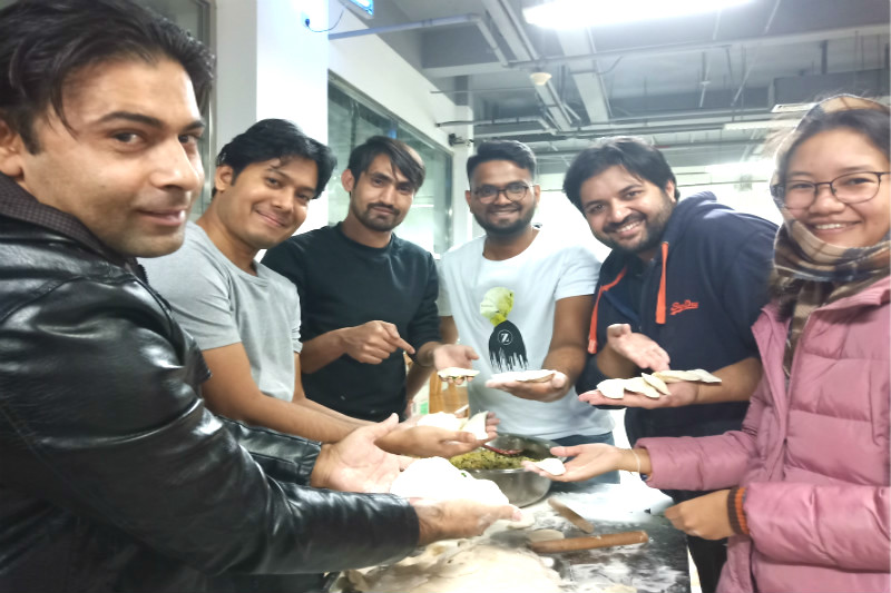 公共事務(wù)處高度重視此項(xiàng)活動(dòng)并做了充分的前期安排和準(zhǔn)備,食堂工作人員根據(jù)國(guó)際學(xué)生的需求準(zhǔn)備了不同的食材。國(guó)際學(xué)生們?cè)谥袊?guó)志愿者的幫助下,逐漸掌握了包餃子的方法,大家興致勃勃參與活動(dòng),餃子數(shù)量逐漸增多。經(jīng)過(guò)一個(gè)多小時(shí)的努力,大家吃上了自己包的熱騰騰的餃子,一位巴基斯坦的同學(xué)還興奮地向大家展示自己包的餃子,活動(dòng)現(xiàn)場(chǎng)氣氛歡愉。