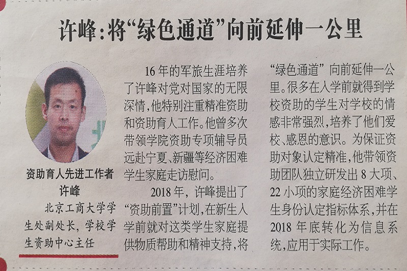 許峰在擔任校資助中心主任期間,注重精準資助和資助育人工作。為保證資助對象認定精準,他帶領學生資助工作隊伍研發出8大項、22小項的家庭經濟困難學生身份認定指標體系,經過反復測試、多次評估,于今年5月將其轉化為信息系統應用于實際工作。他提出了“資助前置”計劃,在新生入學前就對家庭經濟困難的學生提供物質幫助和精神支持,不讓任何一個學生因為家境貧困放棄上大學的機會,將“綠色通道”向前延伸一公里。他還多次帶領學院資助專項輔導員跋山涉水,遠赴寧夏、新疆、貴州、甘肅等地區,走訪慰問我校特困學生家庭。在他的極力推動下,我校在國家級貧困縣——河北蔚縣西合營中學、桃花鎮初級中學以及北董莊小學三校建立“學生資助宣傳大使”實踐基地,構建了“兩地四校”家庭經濟困難學生一體化育人平臺。