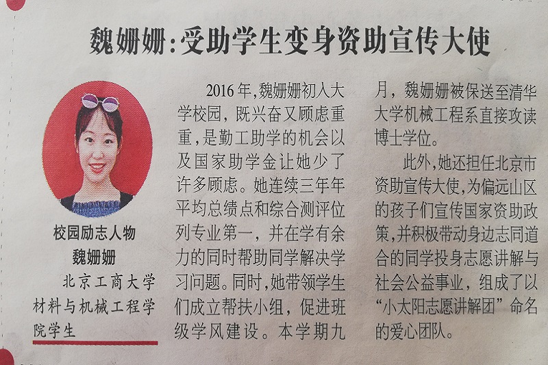 在國家、社會和學校資助政策的幫助下,魏姍姍放下經濟包袱,刻苦努力學習,連續三年績點和綜合測評位列專業第一名,并在國家、市級專業競賽中取得優異成績。2019年9月,她榮獲國家獎學金和校長獎學金,目前已保送至清華大學機械工程系直接攻讀博士學位。“一花獨放不是春”,在自己取得突出成績的同時,她還主動承擔起學院“學業輔導站”的工作,幫助身邊同學一起取得進步。魏姍姍還擔任了兩屆校級、一屆市級“學生資助宣傳大使”,來到家鄉社區、高中母校京郊中學宣傳國家資助政策,用自己的勵志成長經歷去影響教育貧困學子堅定信心,發奮讀書。正如她常說的:“愿以己之力,援他人難時,傳播大愛,點燃希望。”