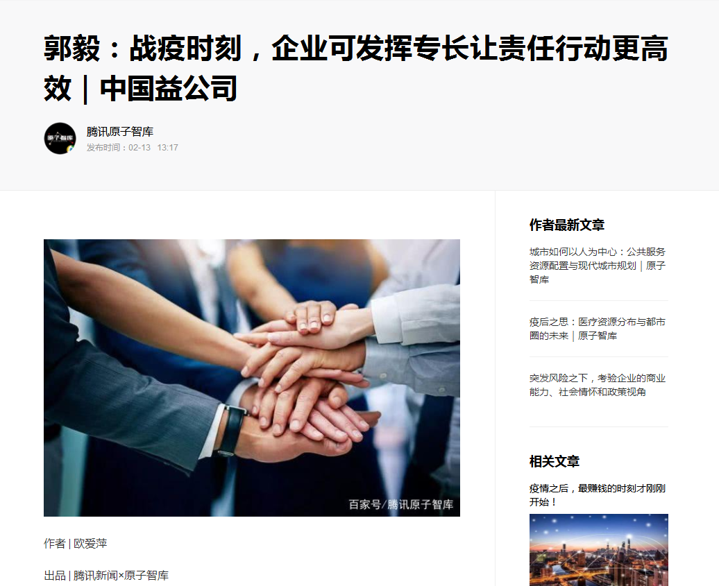 經濟學院郭毅教授作為中國企業社會責任智庫、中國工業企業社會責任智庫、南方周末等多家機構社會責任專家,就疫情防控期間中國各類企業的社會責任表現,接受騰訊新聞、中國社會科學院《商學院》、中國建設報等媒體采訪。郭毅教授對此次疫情中企業所表現出來的社會責任意識高度肯定,指出中國企業并不缺乏社會責任擔當的履責意愿,也在市場化、國際化發展中獲得了參與社會治理的綜合能力,企業社會責任可以也應該成為新時代構建社會治理共同體的重要治理能力來源。建議政府主管部門給與企業更多信任,授權企業或以公共服務購買等方式,充分發揮企業在信息、物流、專業物資生產、民眾社會生活等方面的專業優勢,使其參與到疫情控制和穩定社會的工作當中,形成有效的政府行動、企業責任行動與社會組織公益行動之間的對接機制,構建非常時期社會治理共同體。