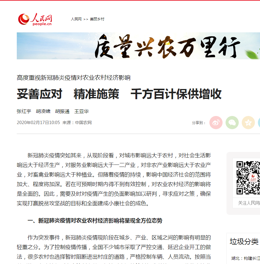 該報告指出疫情對農業產業的沖擊是全面的,提出必須要強化流通管理,保障菜籃子產品供給,抓好春耕春播工作,穩妥有序推動農民工返程務工等對策思路和建議。2月25日,《人民日報》刊發胡凌嘯作為主要完成人的文章《科學應對疫情對農業農村經濟的影響》,該文章分析了此次疫情暴露出的農業農村領域的多重安全危機及危機的形成原因,著眼于保持我國農業農村經濟社會安全穩定,提出了全面加強農業農村危機管理的建議。報告得到中央領導的批示,并被《學習強國》轉載。