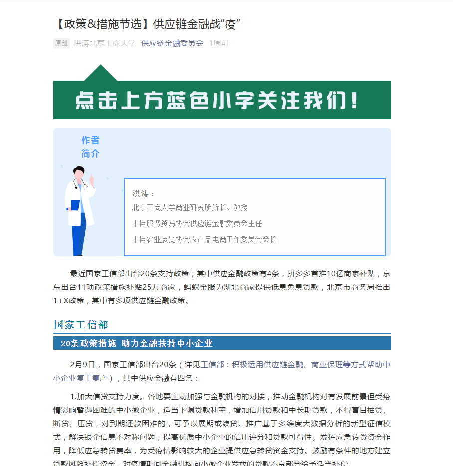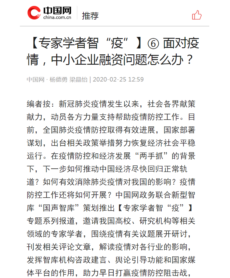 《疫情之下如何為中小企業解決融資困難問題》一文還被“國聲智庫”聯合《中國網》策劃的專家學者智“疫”專題活動采納,該文章分析了疫情對中小企業融資產生的近期和遠期影響,分別對中小企業、金融機構、金融市場和政府部門提出政策建議。文章強調金融機構在風險防范的前提下,盡快推出疫情背景下的新型金融產品,以解中小企業融資的燃眉之急;政府應適時推出新的財稅政策和產業政策,以降低中小企業的負擔,迅速恢復生產。文章一經刊發,即引起人民銀行等監管部門、金融機構和企業界的重視,一些建議已經在國家近期出臺的相關金融政策中得以體現。