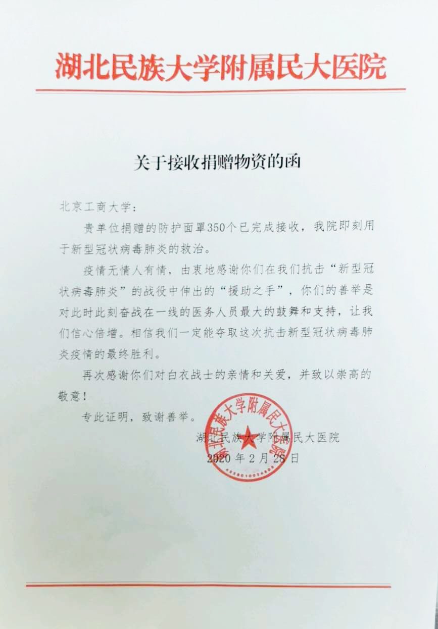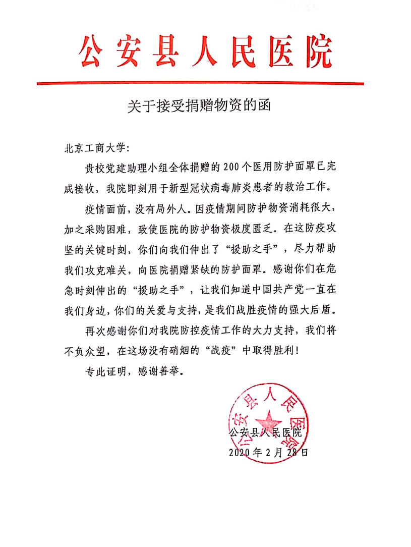 “中國共產黨始終在你身邊!”“工商學子齊努力,共助荊楚戰疫情!”“黨旗所向 疫往無前”“與國同心 共克時艱”一句句帶著黨徽光芒,帶著北工商青年大學生愛國溫度的祝福語伴隨著物資直抵湖北一線。湖北荊州市公安縣人民醫院的領導表示“看到這樣充滿正能量的加油標語,感受到了北京工商大學黨員同學同志式的關心,也給一線醫務工作者增添了信心和力量!對參與此次募捐活動的黨員同學表示衷心的感謝!對北京工商大學表示由衷的敬意!”恩施土家族自治州湖北民族大學附屬民大醫院專程發來的接收函中表示“你們的善舉是對此時此刻奮戰在一線的醫務人員最大的鼓舞和支持,讓我們信心倍增。感謝你們對白衣戰士的親情和關愛,并致以崇高的敬意!”