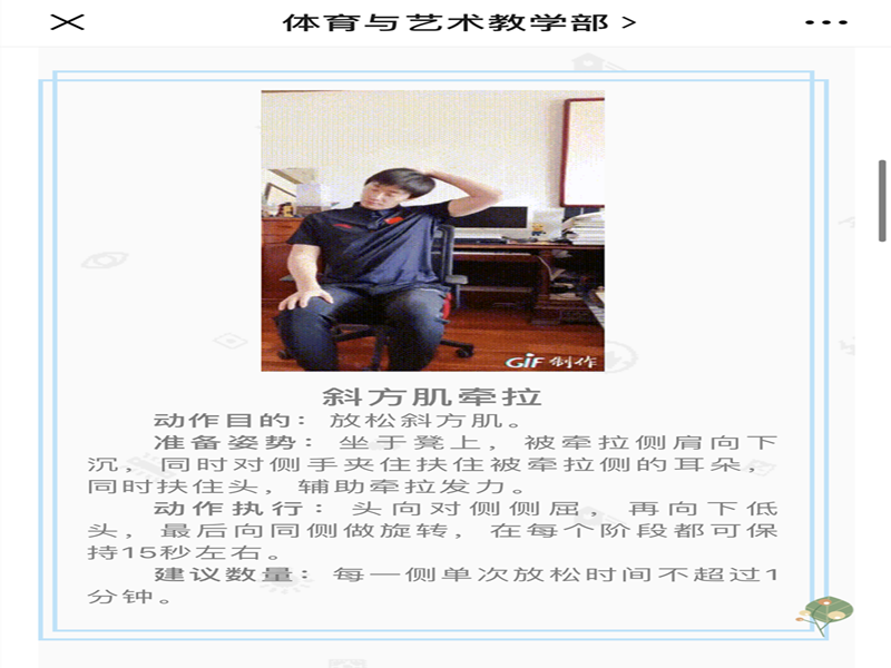 在這場沒有硝煙的戰(zhàn)爭中,提高自身免疫力是抵抗病毒的最好武器。長期居家,長時間使用電子產(chǎn)品,缺少活動,不僅影響身體健康,還容易引發(fā)負面的情緒。針對想鍛煉,缺乏場地器材的情況,體育與藝術教學部的老師們,精心制作了一系列居家鍛煉視頻,設計出了一套合理的鍛煉指南。該系列視頻包含了體能素質(zhì)訓練、肌肉放松拉伸訓練、太極拳步伐、體育舞蹈等。現(xiàn)已在體育與藝術教學部公眾號(微信公眾號搜索體育與藝術教學部即可關注)上發(fā)布推廣,歡迎廣大師生閱讀參考。