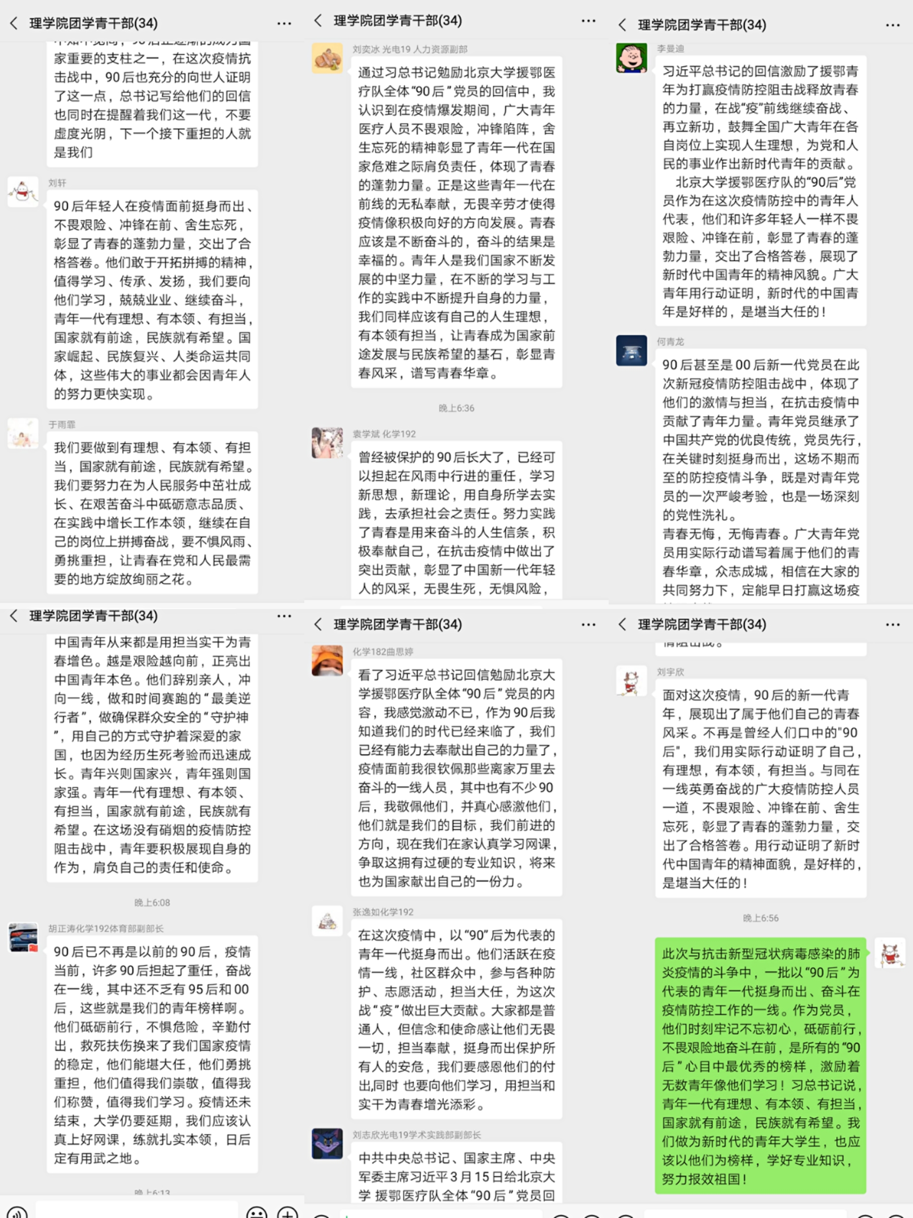 理學院團委通過組織團學青干部線上集中學習、各團支部線下自學的方式對回信進行了深入學習。團學青干部及團支書代表自行學習習主席回信勉勵北京大學援鄂醫療隊全體“90后”黨員內容后,積極發言,表達出自己對于“90后”在抗疫中所做出杰出貢獻的想法。同學們深刻理解了總書記在回信中所指出的,“青年一代有理想、有本領、有擔當,國家就有前途,民族就有希望。”。