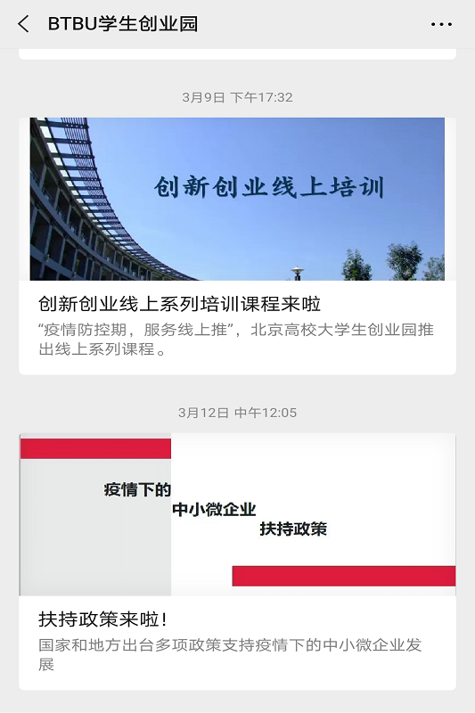 疫情期間,通過創(chuàng)業(yè)園微信群等方式積極與團隊溝通交流,線上調(diào)研同學(xué)們的相關(guān)需求,積極關(guān)懷在湖北的學(xué)生,積極搜集整理疫情下國家和北京市的創(chuàng)業(yè)支持政策,并開展了“創(chuàng)業(yè)說”---創(chuàng)業(yè)者心路歷程分享活動,采取線上公眾號推文的形式,將創(chuàng)業(yè)園優(yōu)秀入駐團隊負責(zé)人的創(chuàng)業(yè)心路歷程和經(jīng)驗分享給同學(xué)們,讓同學(xué)們了解大學(xué)生創(chuàng)業(yè)的歷程,從文字中體會創(chuàng)業(yè)者的創(chuàng)新與拼搏精神。