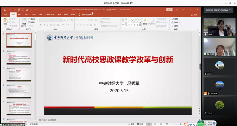 為迎接學(xué)校70周年校慶,5月15日上午,馬克思主義學(xué)院通過騰訊會議舉辦了“迎校慶70周年”專題講座暨第九期“問道玉淵潭”高端學(xué)術(shù)論壇。中央財經(jīng)大學(xué)馬克思主義學(xué)院院長、博士生導(dǎo)師馮秀軍教授應(yīng)邀作了題為“新時代高校思政課教學(xué)改革與創(chuàng)新”的專題報告。馬克思主義學(xué)院院長王魯娜、黨總支副書記樊江濤、學(xué)院全體教師和研究生參加了此次論壇。論壇由學(xué)院副院長姚洪越主持。